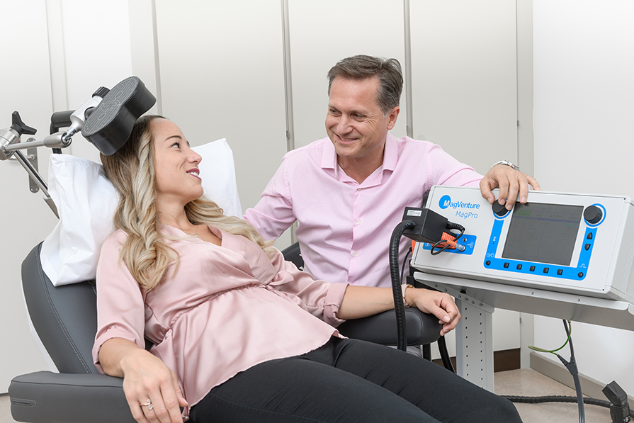 Die repetitive transkranielle Magnetstimulation (rTMS) wurde in den 1980er-Jahren zunächst für Forschungszwecke entwickelt. In der weiteren Entwicklung folgten Studien, hauptsächlich zur Behandlung von Depressionen. Das Prinzip der rTMS basiert auf elektromagnetischer Wirkung (Induktion). Dort wo elektrische Ströme fliessen – zum Beispiel bei Nervenzellen im Gehirn – gibt es auch immer ein entsprechendes Magnetfeld. Platziert man nun eine stromdurchflossene Spule über dem Kopf, so beeinflusst und stimuliert das Magnetfeld der Spule die Nervenzellen des Gehirnes: Die Zellen regieren auf das Magnetfeld von aussen und geben in der Folge entsprechende Impulse und damit Informationen an andere Nervenzellen in der Umgebung ab.